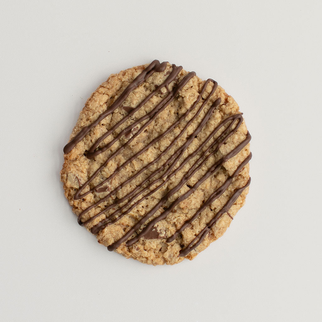 Oatmeal milk chocolate cookie wth crunchy toffee bits, drizzled with milk chocolate.