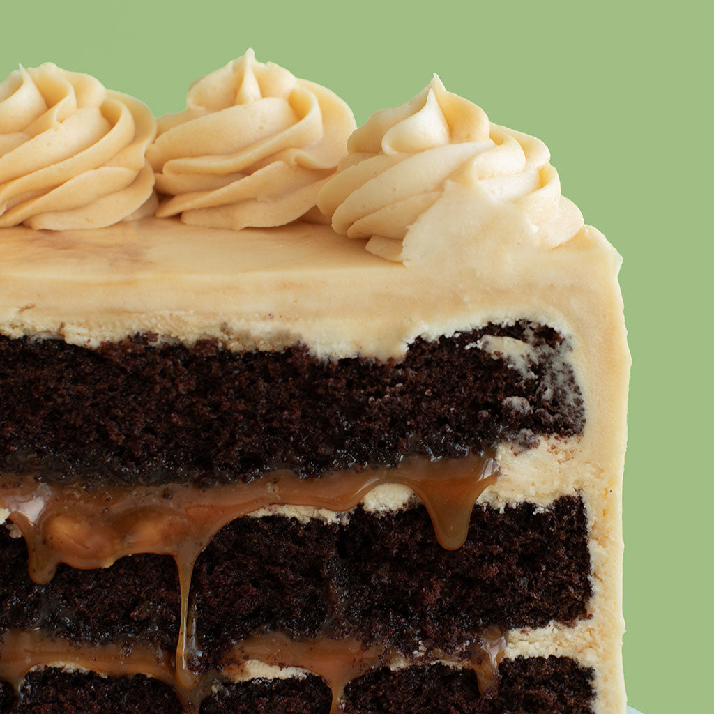 Indulge in this decadent three-layer Chocolate Caramel cake, made with rich chocolate cake, thick buttery caramel filling, and smooth vanilla caramel buttercream. Finished with a delicate pinch of Maldon salt for the perfect sweet-and-salty balance. Personalize your cake with a short and sweet message.