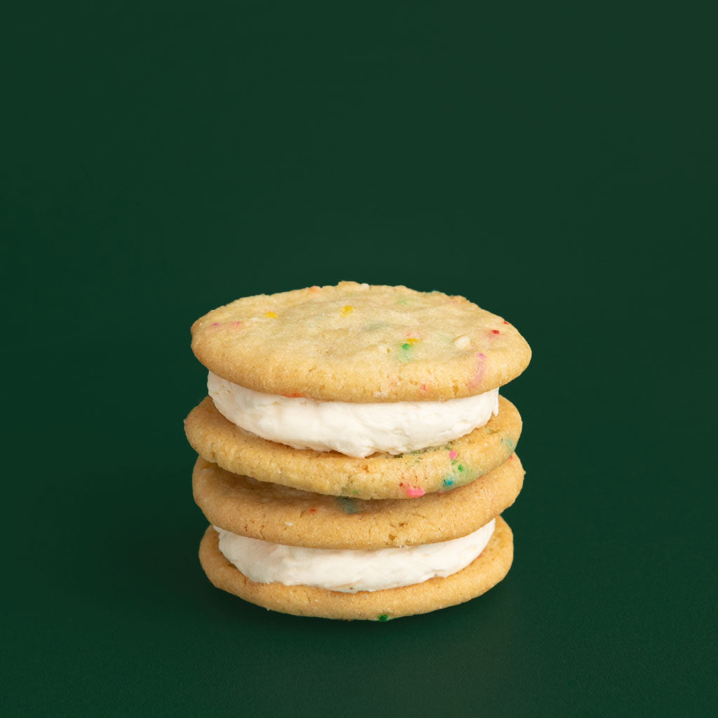 Delight in our Confetti Sandwich Cookies, featuring two soft sugar cookies packed with vibrant rainbow confetti and filled with creamy white vanilla buttercream. These colorful cookies are the perfect addition to birthday parties, celebrations, or as a sweet, freshly baked gift for loved ones.