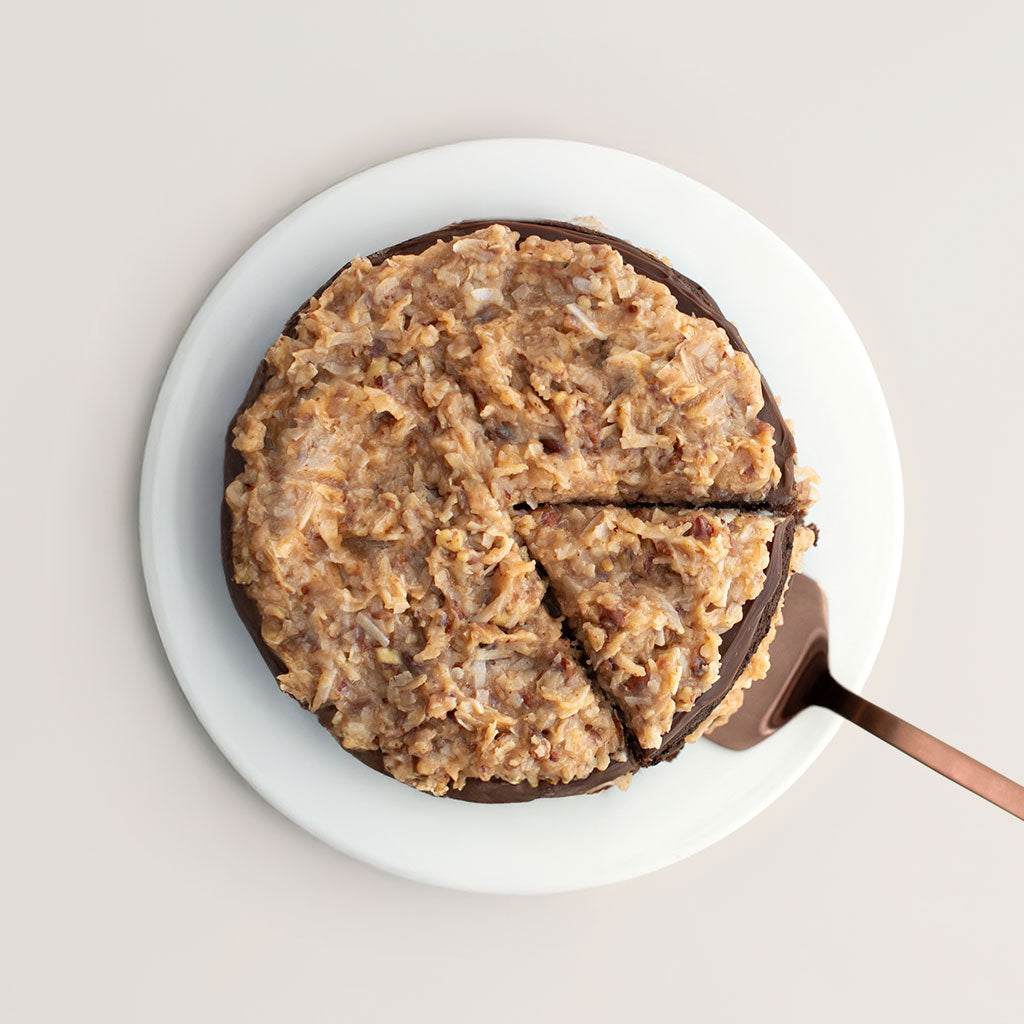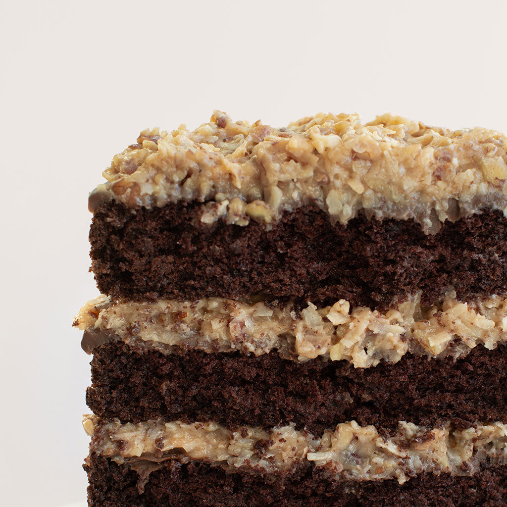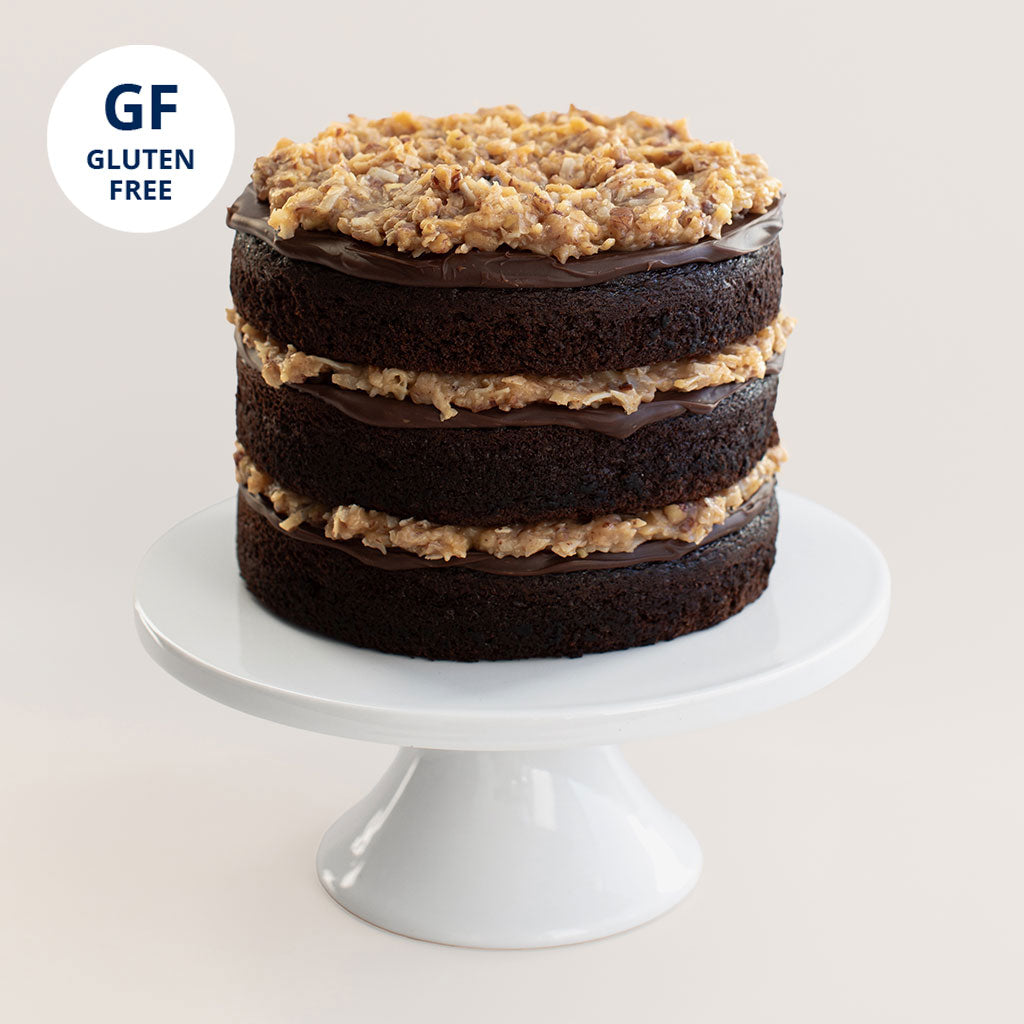 The ultimate indulgence. Three layers of rich gluten free chocolate cake layered with whipped chocolate ganache and topped with sweet coconut pecan filling.