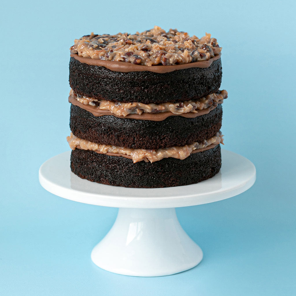The ultimate indulgence. Three layers of rich gluten free chocolate cake layered with whipped Carmelia milk chocolate ganache and topped with sweet coconut pecan filling.