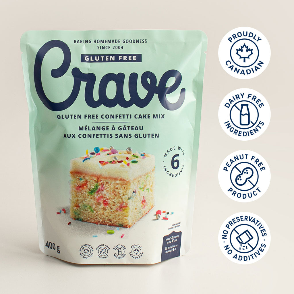 Enjoy bakery quality cake at home with Crave Gluten Free Confetti Cake Mix, inspired by the original recipe that made our Canadian bakeries a favourite now crafted to be enjoyed by even more people. Made with just six simple, high quality ingredients, this mix delivers the same rich, moist flavour, without gluten or added preservatives—proof that real, honest ingredients make the best desserts. It’s also dairy free and peanut free, making it an inclusive and safe choice for households with common dietary needs.