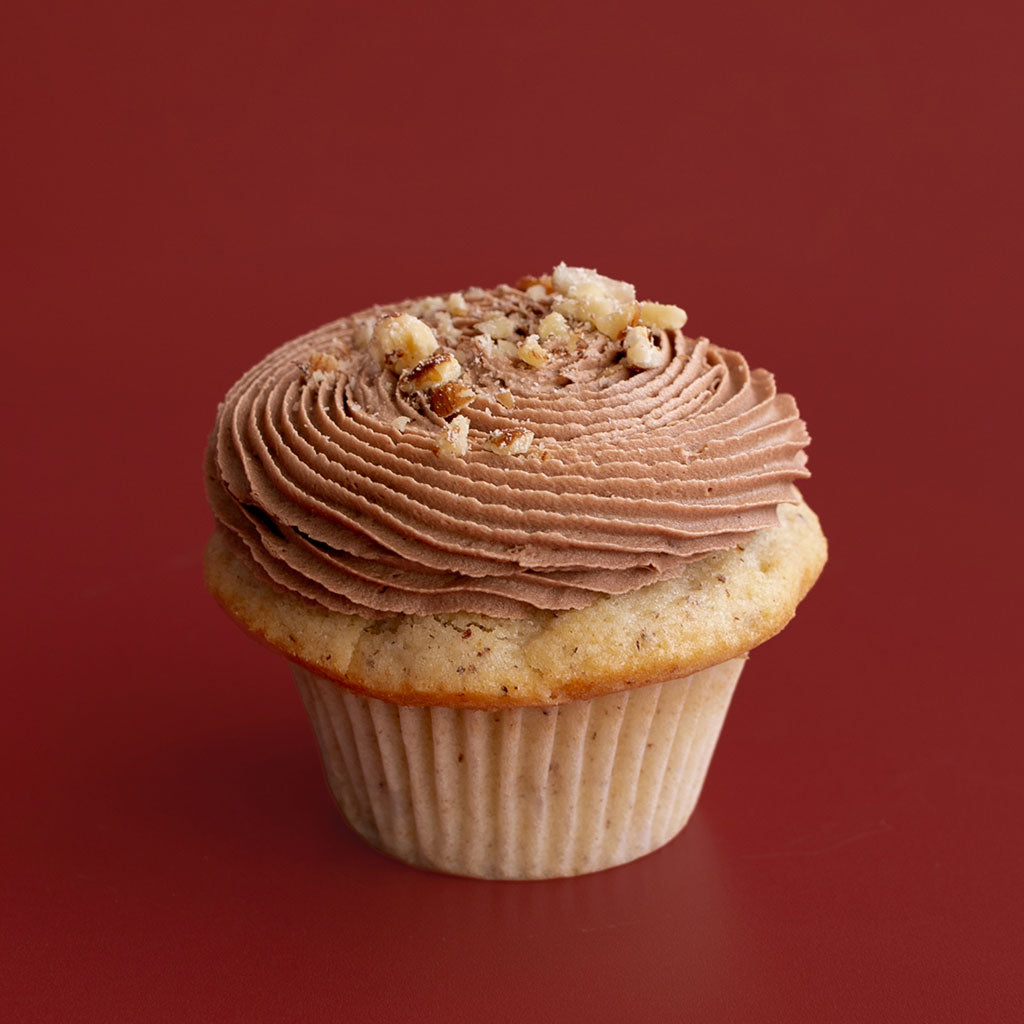 Chocolate Hazelnut | A delicate hazelnut vanilla cupcake topped with rich chocolate hazelnut buttercream and finished with a sprinkle of chopped hazelnuts for a perfect nutty crunch.